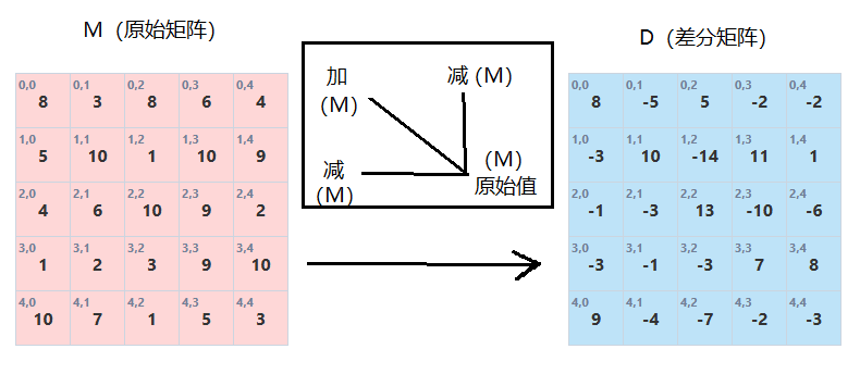D[i][j] = M[i][j] - M[i-1][j] - M[i][j-1] + M[i-1][j-1]