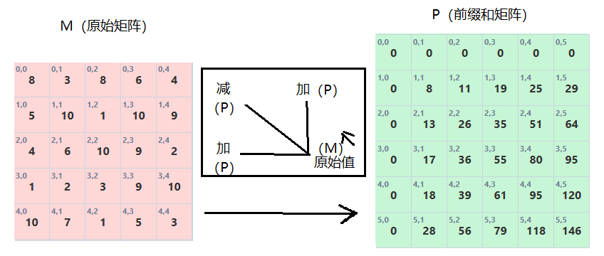 P[i][j] = M[i-1][j-1] + P[i-1][j] + P[i][j-1] - P[i-1][j-1]