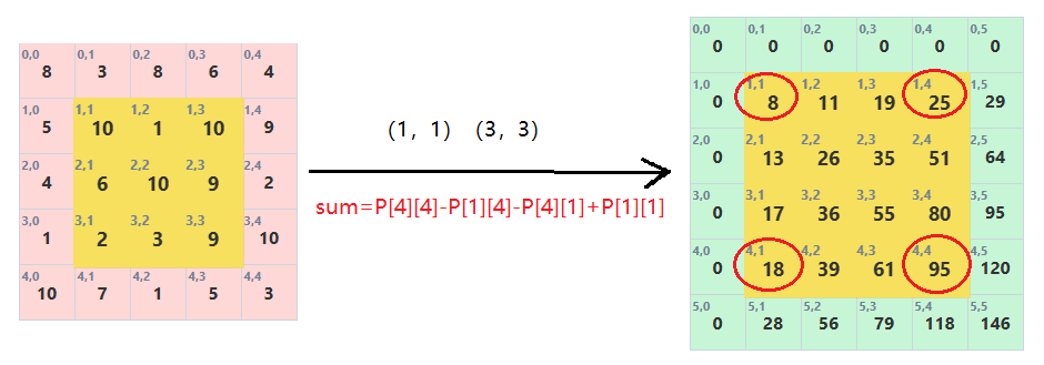 prefix[i][j] = matrix[i-1][j-1] + prefix[i-1][j] + prefix[i][j-1] - prefix[i-1][j-1];