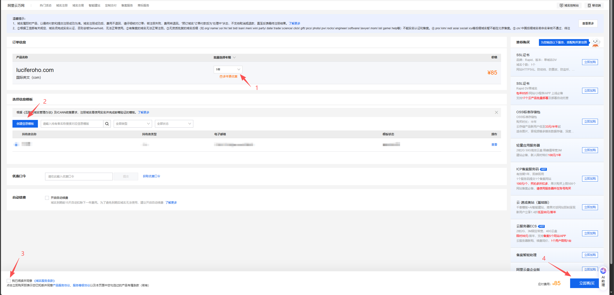搜索域名 - 选择注册年限,创建信息模板(首次操作时),点击购买